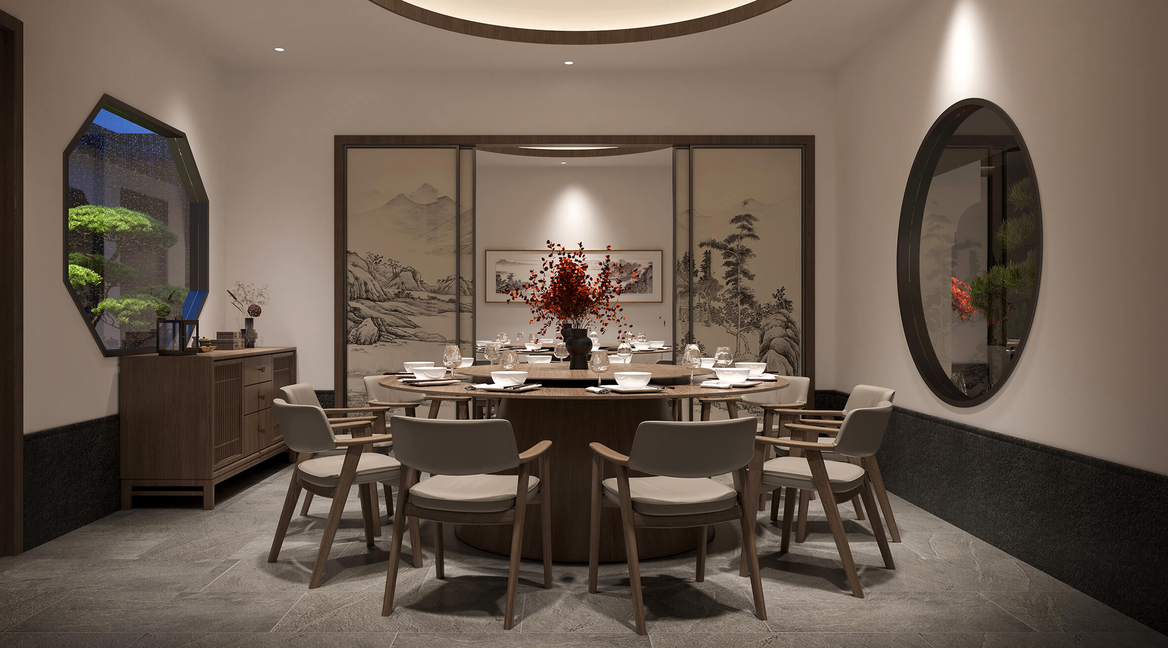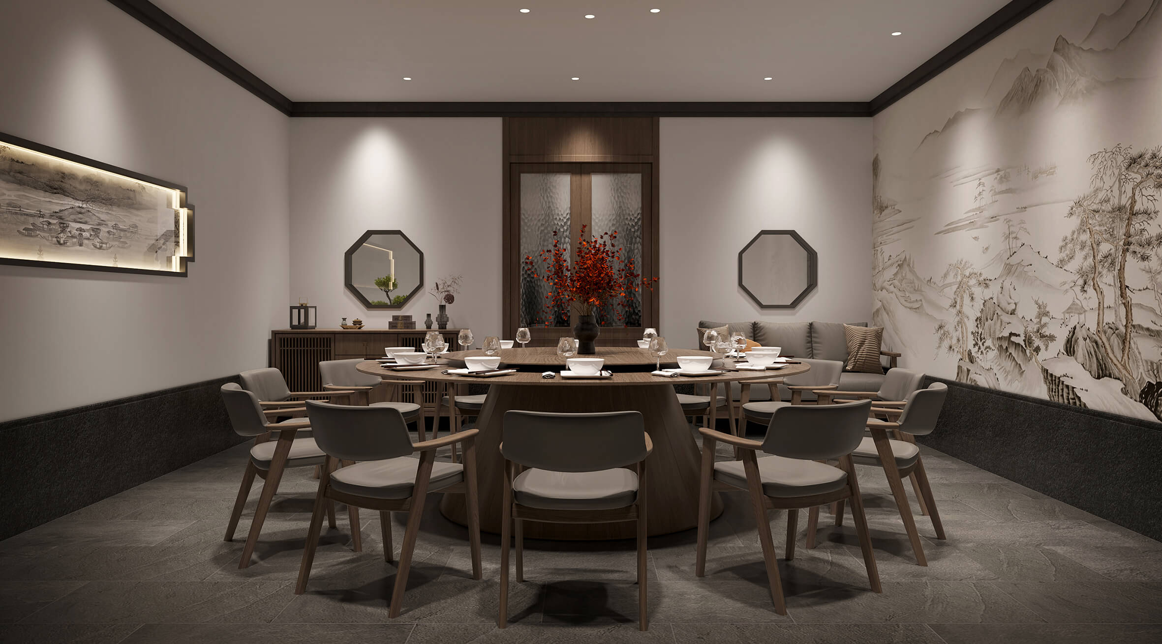 以古朴的灰砖背景墙去协调深沉安静的木质桌椅,自然和谐,天然去雕饰的纯朴之风弥漫了每个角落,墙面采用徽派历史悠久的砖雕艺术装点,营造出徽派文化独有的雅致氛围。