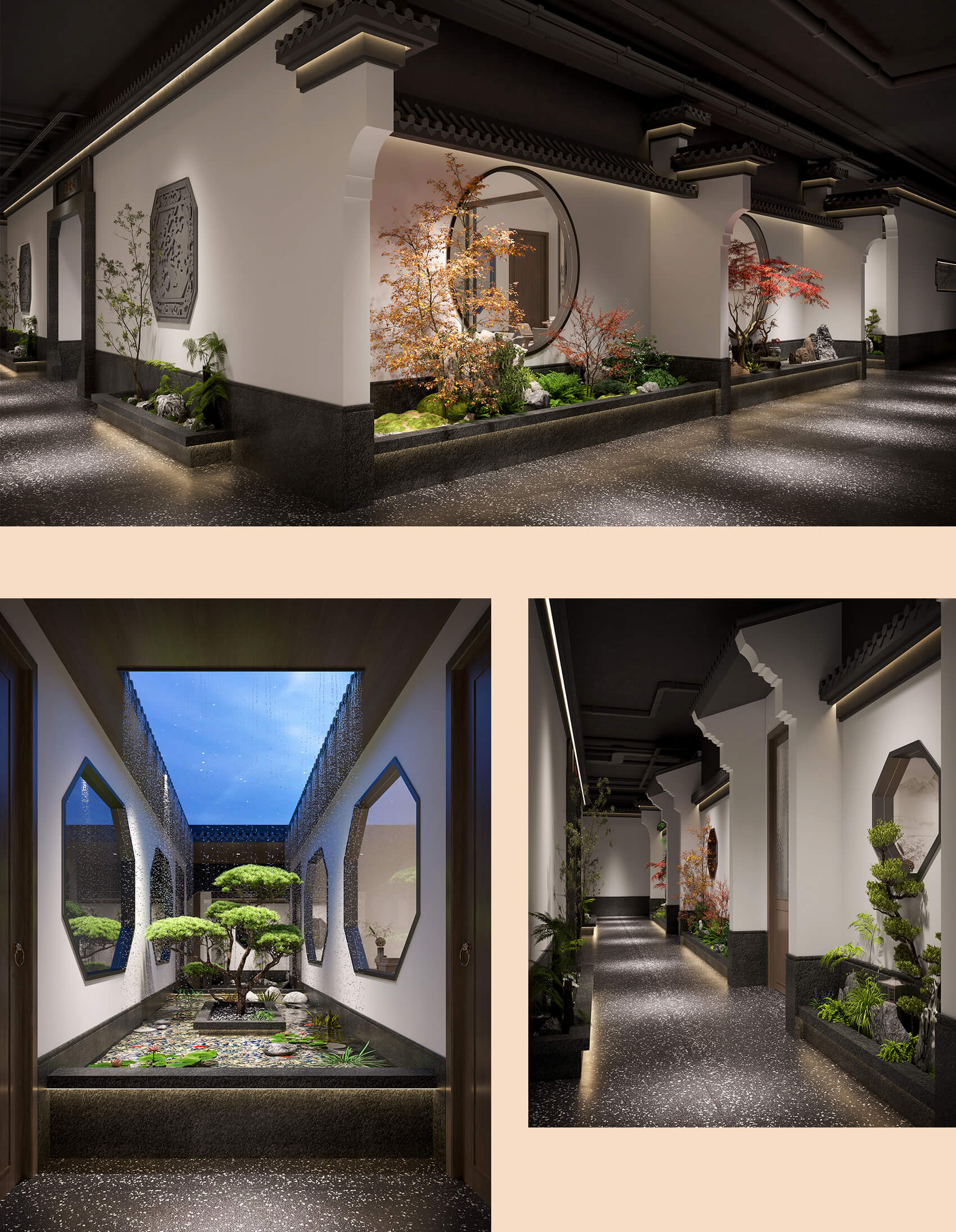 整体设计主打灰、白两色,材质上运用仿古瓷砖及艺术肌理漆,以现代简约的设计手法,将时尚感和通透感融入古风雅韵,塑造整个空间的徽派风韵。